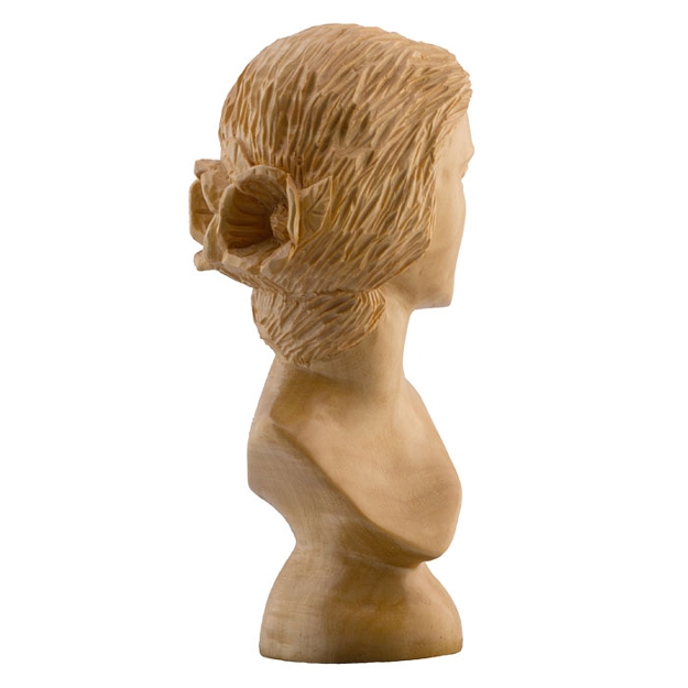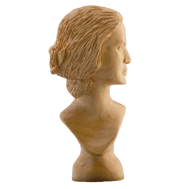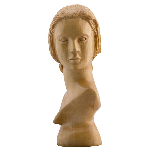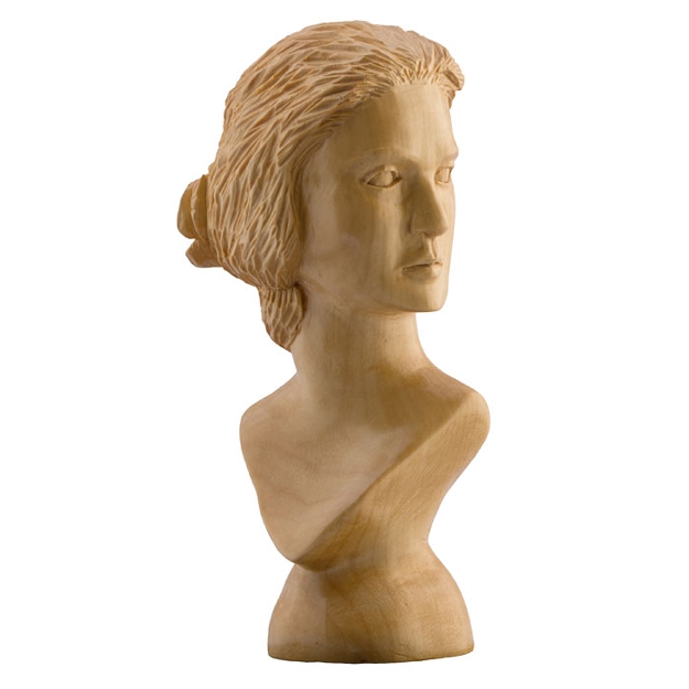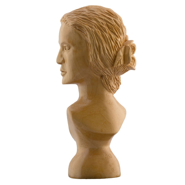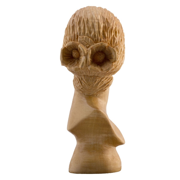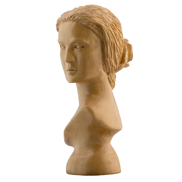 Bass wood blank, band sawed in two dimensions. This is from a weekend seminar with Janet Denton Cordell. Hand carved and sanded. Finished using only clear finish and an old brown paper shopping bag. 8" h