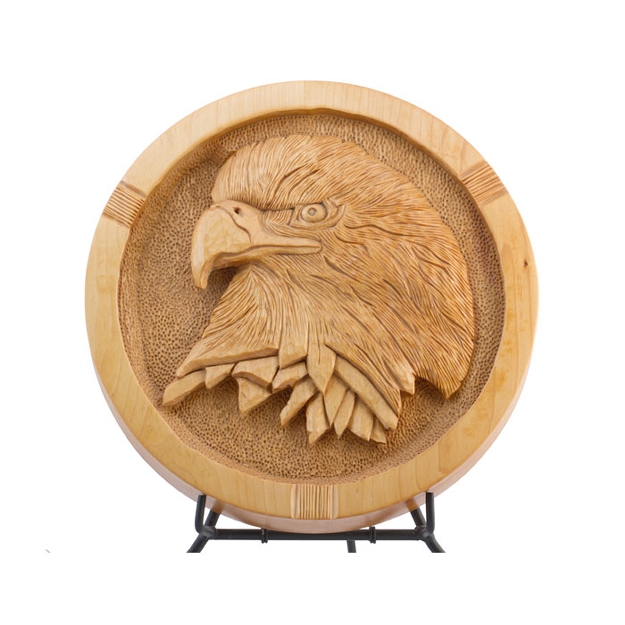 Basswood band sawed to 13 inch diameter. Inside rim, freehand router. Hand carved, Background texture produced by a hand punch fashioned from a 16 penny nail. Finished with boiled linseed oil and paste wax. Adopted with modifications from a project in Wood Carving Illustrated (spring/summer 98) by W.F. (Bill) Judt.