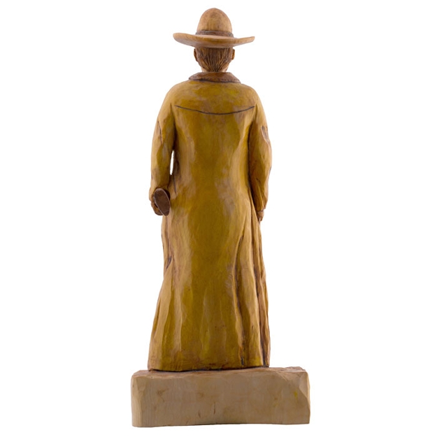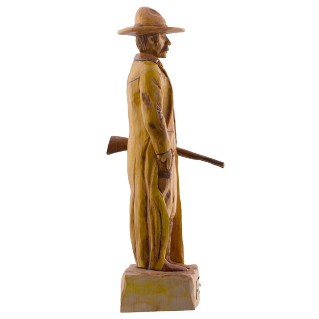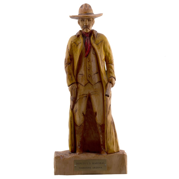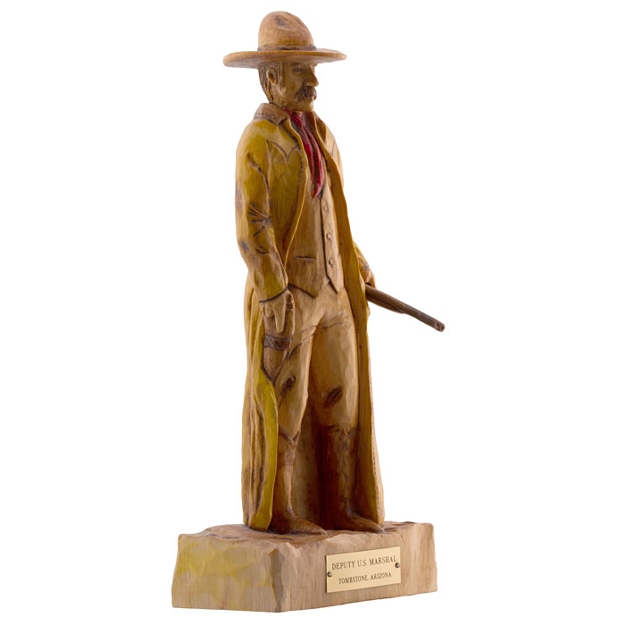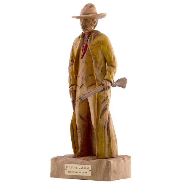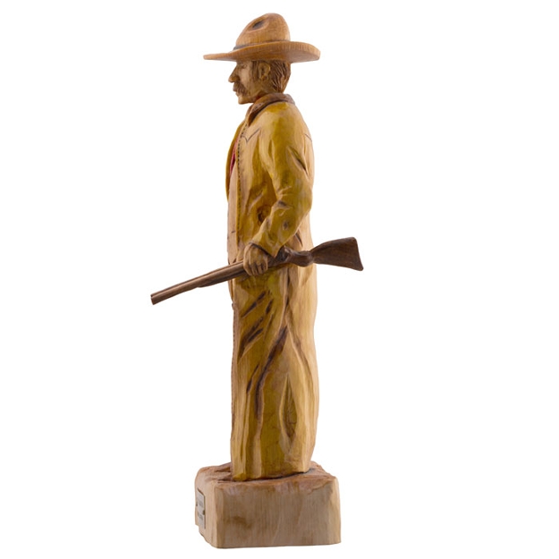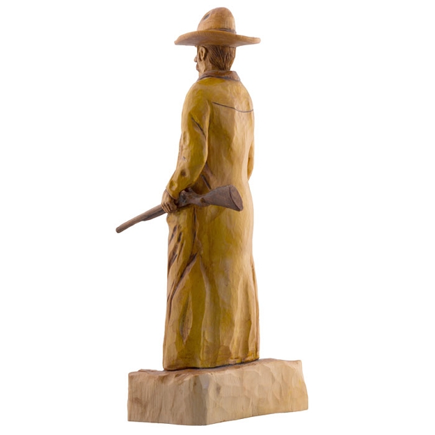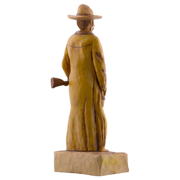 At times I work from photographs, sometimes staged in period garb. I sketched out this pattern and band sawed the general shape out of a block of basswood. The shotgun and hand holding it is from a photo of my cousin Chuck. The hand pulling back the duster and reaching for the single action Colt .45 is my hand. The inspiration for the face probably comes from the many pictures and illustrations of Wyatt Earp I have seen over the years. 17" h