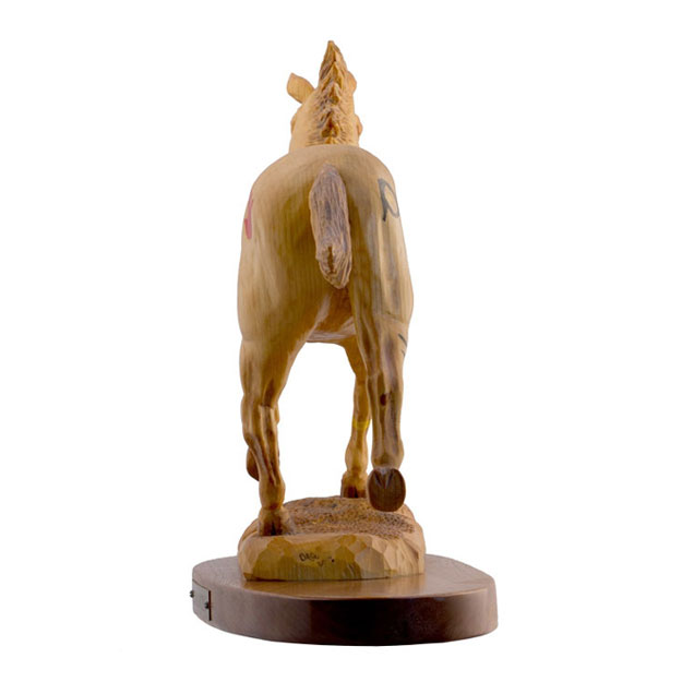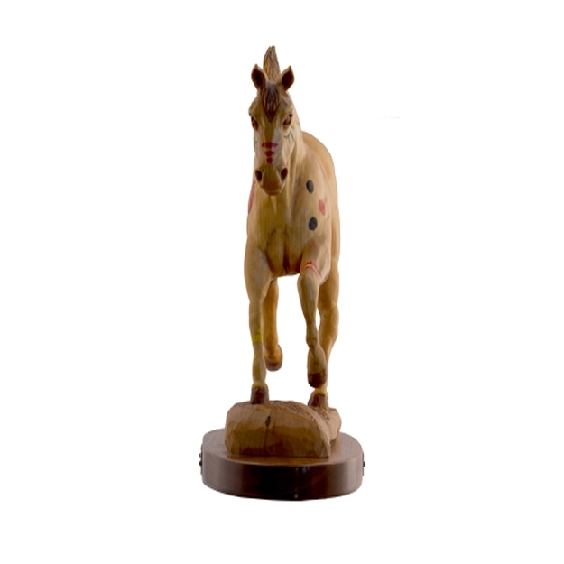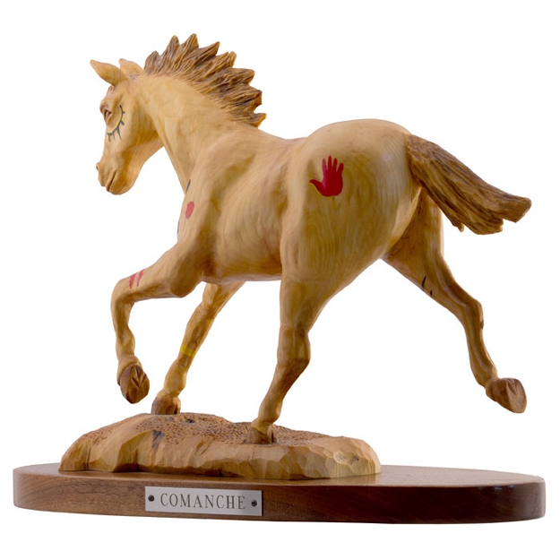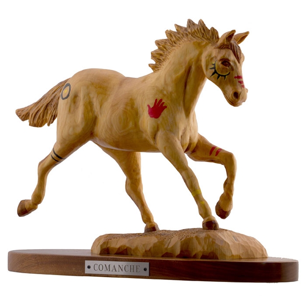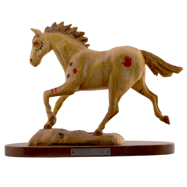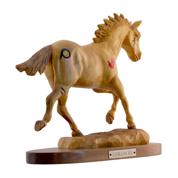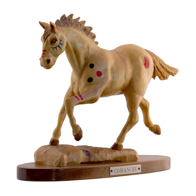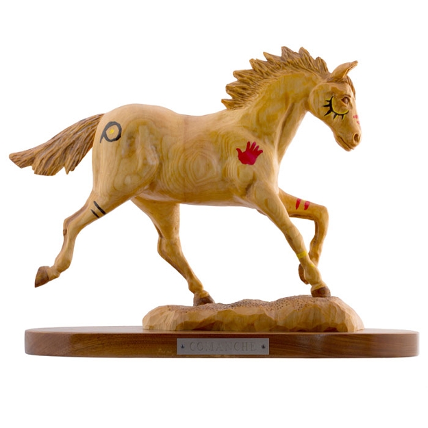 Comanche braves marked their war ponies with paint rather than a branding iron. This acknowledged the simple truth that although you could possess one of these wild mustangs, you could never really own one. Basswood, band sawed one dimension. Finished in boiled linseed oil and liquid wax. 11"h X 14" w