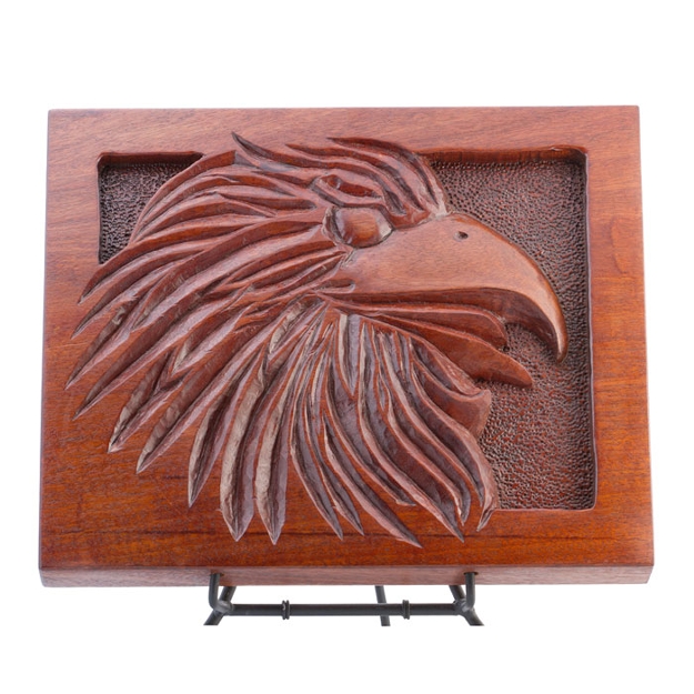 I found a photograph in a magazine and was able to make a pattern from it. Even though I rarely do relief carvings, I was intrigued by the clean, bold lines. The wood is Honduran mahogany, new for me. The inside corners are routed and the rest hand carved with V gouges and straight chisels. The background texture is created with a blunted 16 penny nail. It is finished with boiled linseed oil and clear coat.