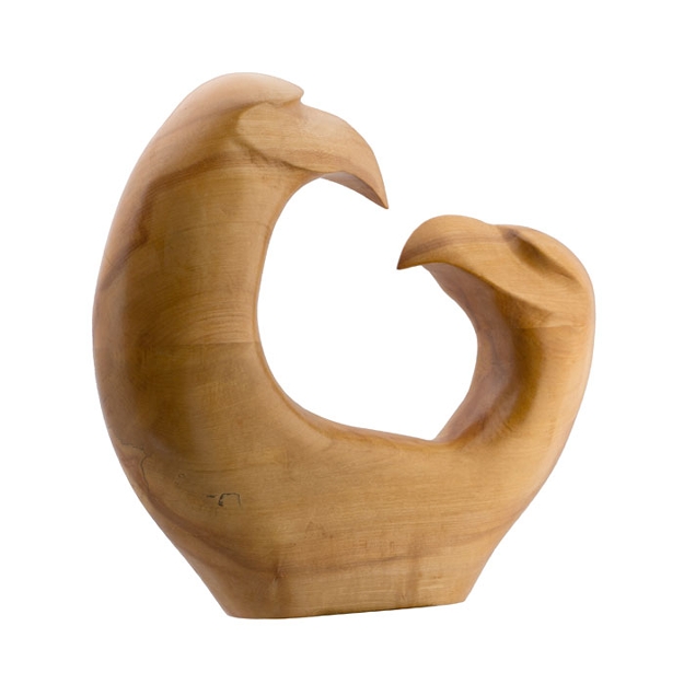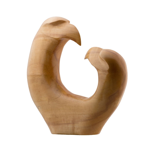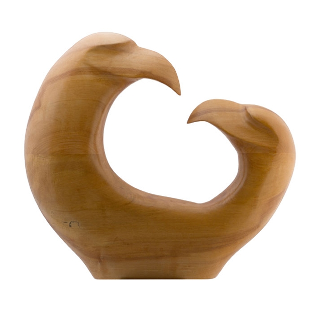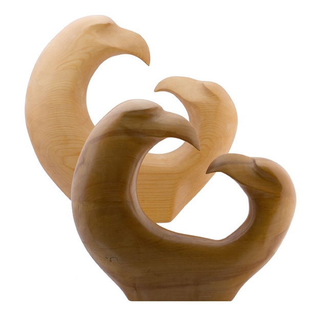 Eagles mate for life. It's a fact, look it up. This is two variations on the same theme. The first carving was done in basswood. The second piece is in maple purchased from a saw mill in Andover, New Jersey. Huge mistake, maple is just too difficult a wood to work by hand. The inspiration for the design came on a trip to British Columbia, Canada in 2000. The original sketch was made on the back of an old envelope on a street corner in Banff. Band sawed, chain sawed, electric grinder, hand carved and hand shaped. The final finish is achieved through hand sanding and an application of boiled linseed oil, clear sealer and hand rubbed paste wax. 14" h X 15" w