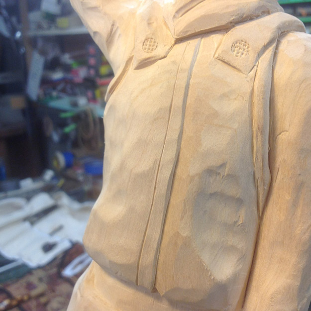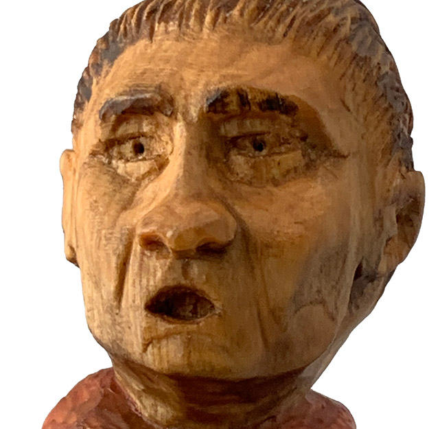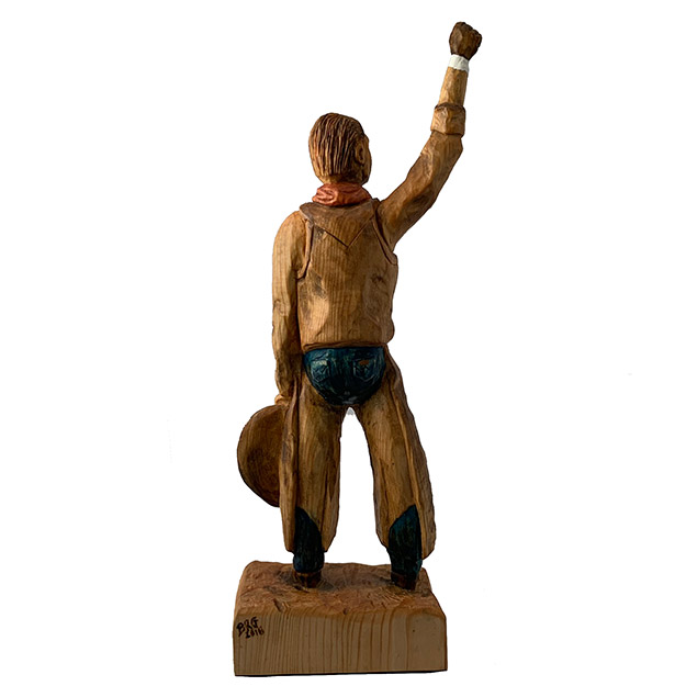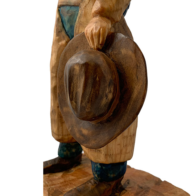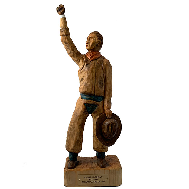 Eight seconds!! That's all it takes holding on by one hand to a bucking, swirling, kicking bull to earn a qualified ride and maybe a share of that rodeo's prize money. Yet, we have been to countless rodeos out west in towns with names like Jackson Hole, Cody, Heber City and Columbia Falls where not one cowboy makes it even close to the eight seconds. It is man against bull and more times than not, the bull comes out the winner. So, when you make the eight, it is great !! Truly, the Toughest Sport On Dirt. Freehand design from photos my wife took of me, band sawed, hand carved (over a three year period). Finished with boiled linseed oil, water based washes for color, sealed and liquid wax. Basswood, 17 " h.