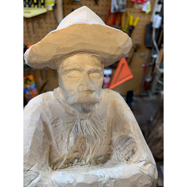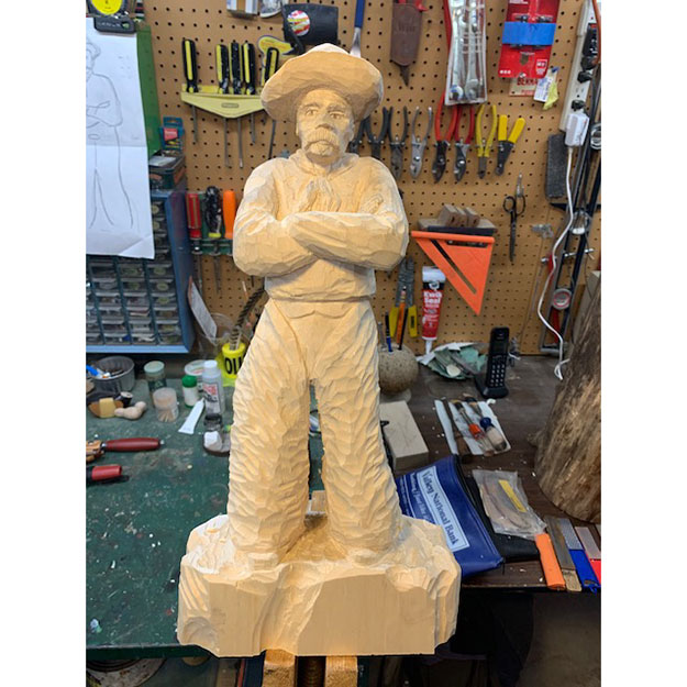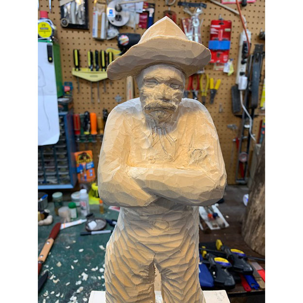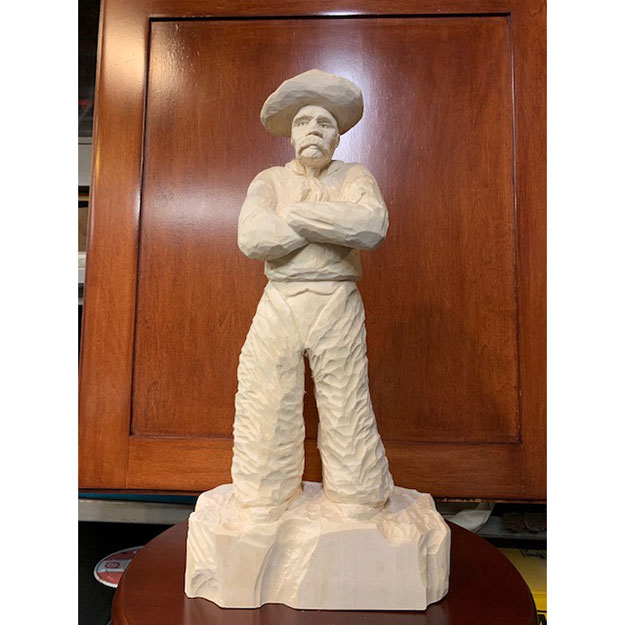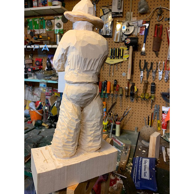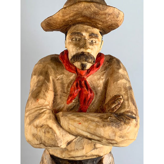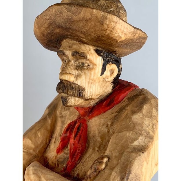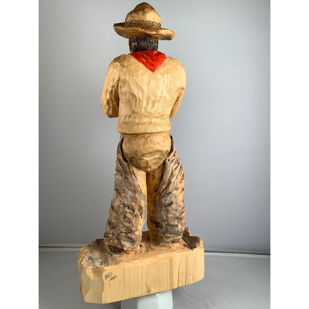 This is the sixth in a series of full figure cowboys created beginning in 2003. All in the series are approximately the same height and dimensions. This is roughly the maximum carving I can get out of a slab of wood that is about four inches thick.