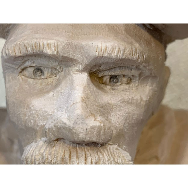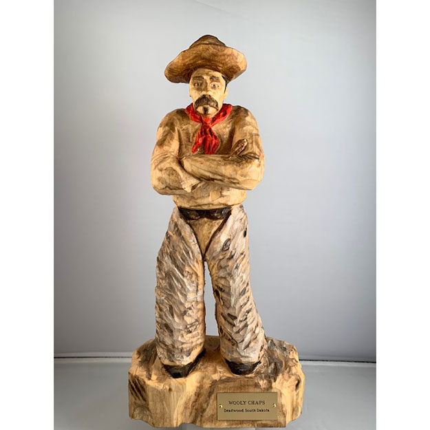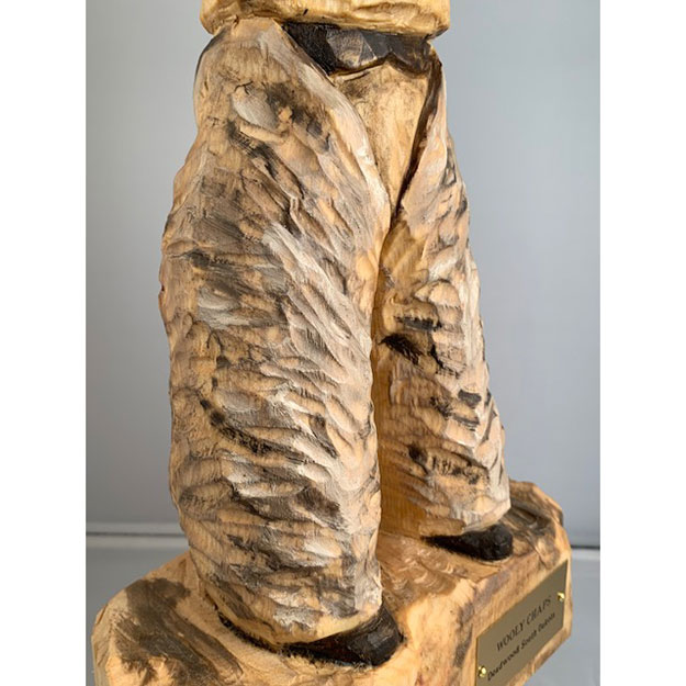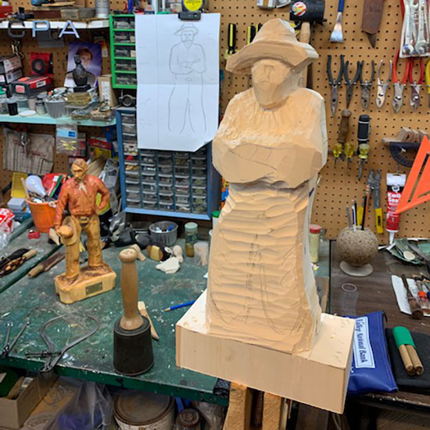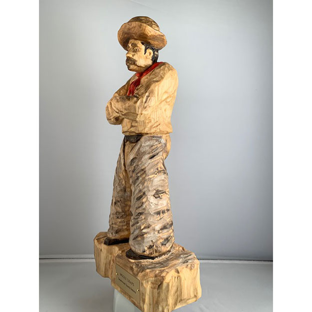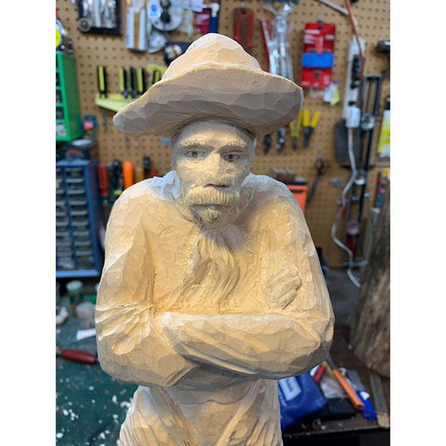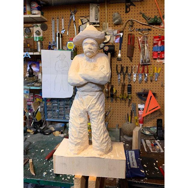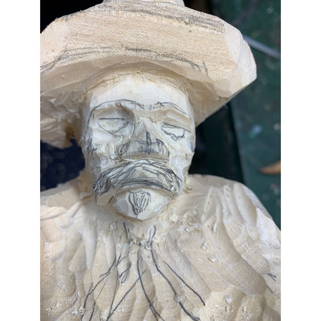 This is the sixth in a series of full figure cowboys created beginning in 2003. All in the series are approximately the same height and dimensions. This is roughly the maximum carving I can get out of a slab of wood that is about four inches thick.
