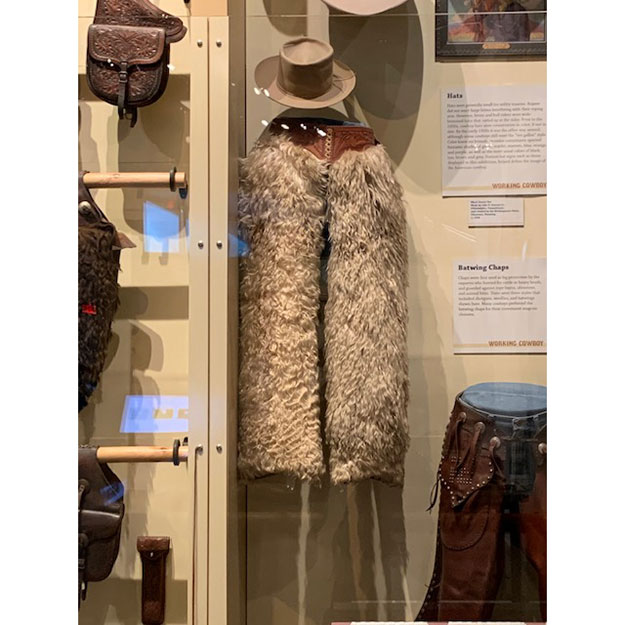 While wooly chaps are practical, they are also very showy. For that reason they were popular with 1800s wild west show performers and Western artists. (The renowned Western artist Frederic Remington created a bronze statue titled "Wooly Chaps," also known as "The Bronco Buster." It depicts a cowboy wearing wooly chaps riding a bucking horse.) Wooly chaps are still popular today for reasons of practicality and showiness.