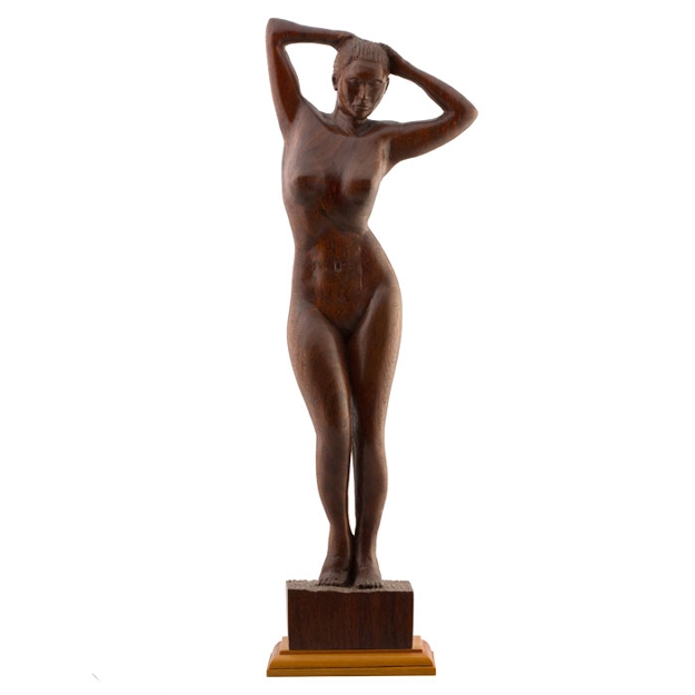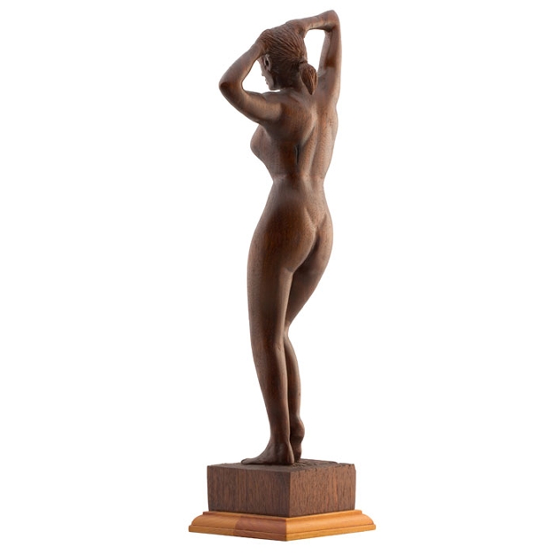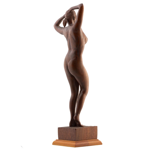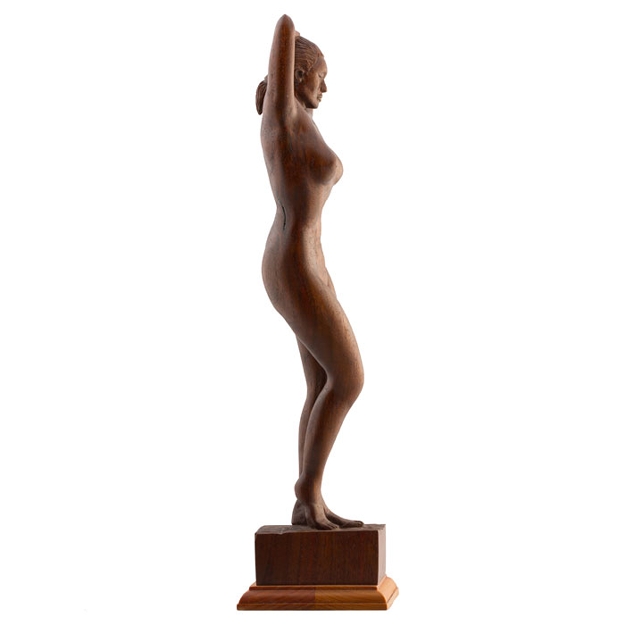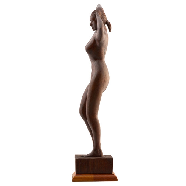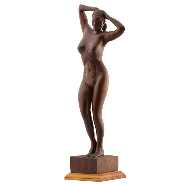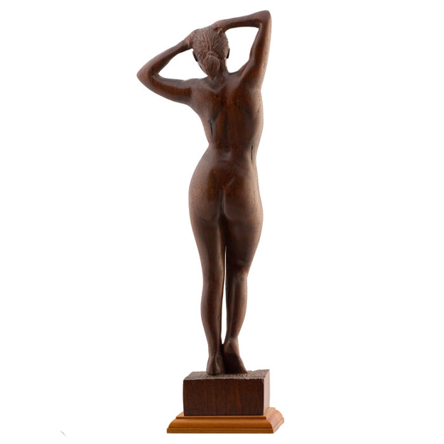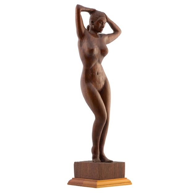 "Standing wet and naked in the garden" is a line from the song Delta Lady written by Leon Russell and made famous by Joe Cocker. Inspiration for a carving sometimes comes from many places. Black walnut, band sawed two dimensions. Hand carved and shaped. Finished with hand rubbed tung oil. This is based on a power carving of Roy Gonzales. 18" h